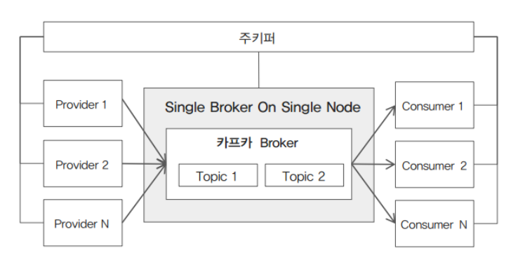 첫 번째 아키텍처는 1대의 카프카 서버만 설치하고, 1개의 broker만 구성을 했다. 대량의 발생/소비 요건이 없고 업무 도메인이 단순할 때 이용한다.