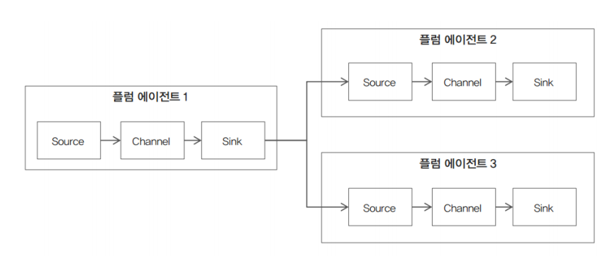 첫 번째 아키텍처는 원천에 있는 파일, DB를 Source가 수집을 하여 Channel로 전송을 하고 Channel이 Sink로 전송을 하고 Sink가 하둡(HDFS)에 적재를 하는 기본적인 데이터 파이프라인이다.