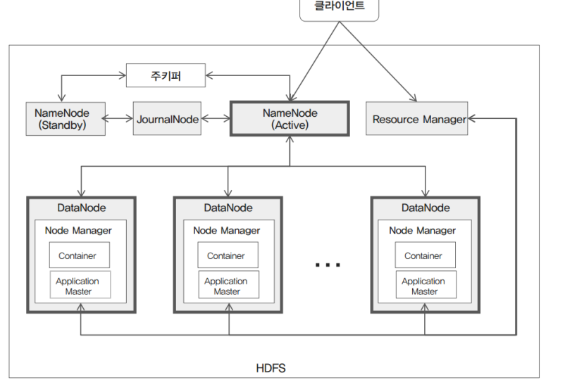 NameNode Active/Stand-By 및 JournalNode가 추가되었고 주키퍼 분산 코디네이터 역할을 한다. Resource Manager가 자원들을 관리를 해준다. 하둡1.x 보다 안정성이 좋다.