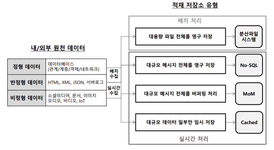 원천데이터에는 정형,반정형,비정형 데이터가 있다. 문제는 형태도 다양한데 배치 수집도 다르다. 적재 저장소 유형은 크게 2가지로 구분된다. 배치처리와 실시간 처리로 구분된다. 배치처리는 큰 데이터를 처리, 실시간처리는 작은 메세지를 처리 한다고 볼 수 있다.