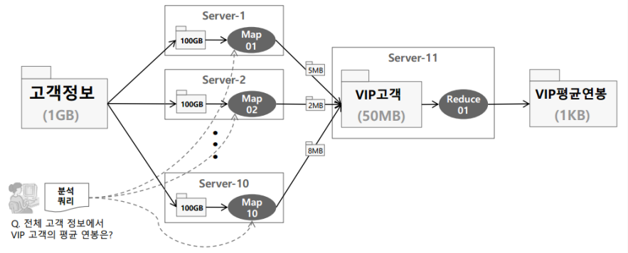 분산병렬 처리에서의핵심은 여러 컴퓨터에 분산 저장돼 있는 데이터로부터 어떻게 효율적으로 일을 나눠서(Map) 실행시킬 수 있는지, 다음으로 여러 컴퓨터가 나눠서 실행한 결과들을 어떻게 하나로 모으냐(Reduce)는 것이다. 이를 쉽고 편리하게 지원하는 프레임워크가 하둡의 맵리듀스(MapReduce)다.