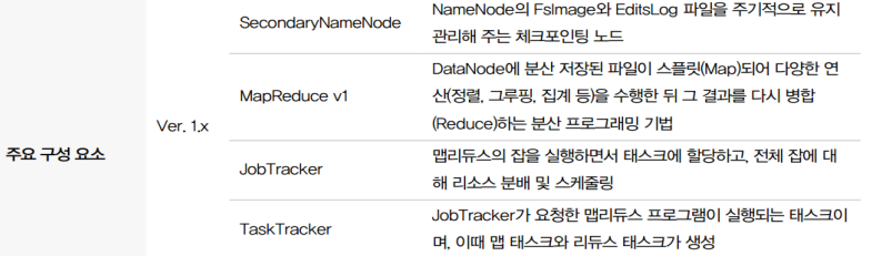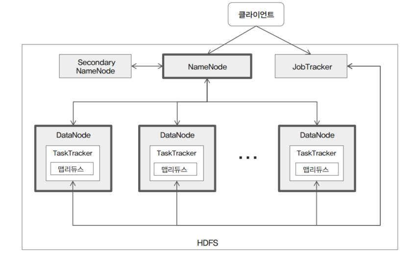 클라이언트가 데이터를 저장한다고 했을 때 DataNode에 데이터를 분산해서 저장을 한다. NameNode 파일 메타데이터 정보를 관리하며 클라이언트 요청을 처리한다. Secondary NameNode는 백업 관리하는 역할이다. JobTracker는 맵리듀스를 스케줄링을 담당하고 모니터링을 한다.