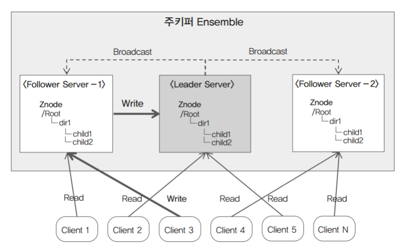 3대의 주키퍼 서버가 있는데 그 중 하나는 반드시 Leader Server 여야한다. 각각의 분산된 서버(client)들은 본인들의 환경설정보 및 데이터 정보를 주키퍼 Ensemble에 저장을 한다. 예를 들어 client3번이 Follower server-1에 변경된 사항을 저장을 하고 Follower server-1은 Leader Server에 변경된 서버에 알리고 Leader Server가 나머지 Follower server에 공유를 한다.