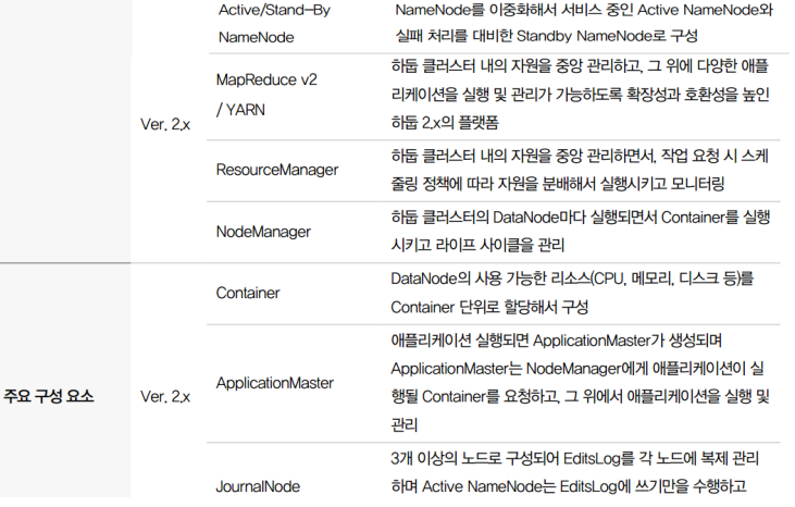 하둡 버전 2.x로 오면서 자체적으로 NameNode Active/Stand-By가 추가되었고, MapReduce에서 YARN이 추가되었다. 기존 하둡1.x 버전에서는 리소스 관리를 취약하다는 단점이 있어서 해결책으로 나왔다.