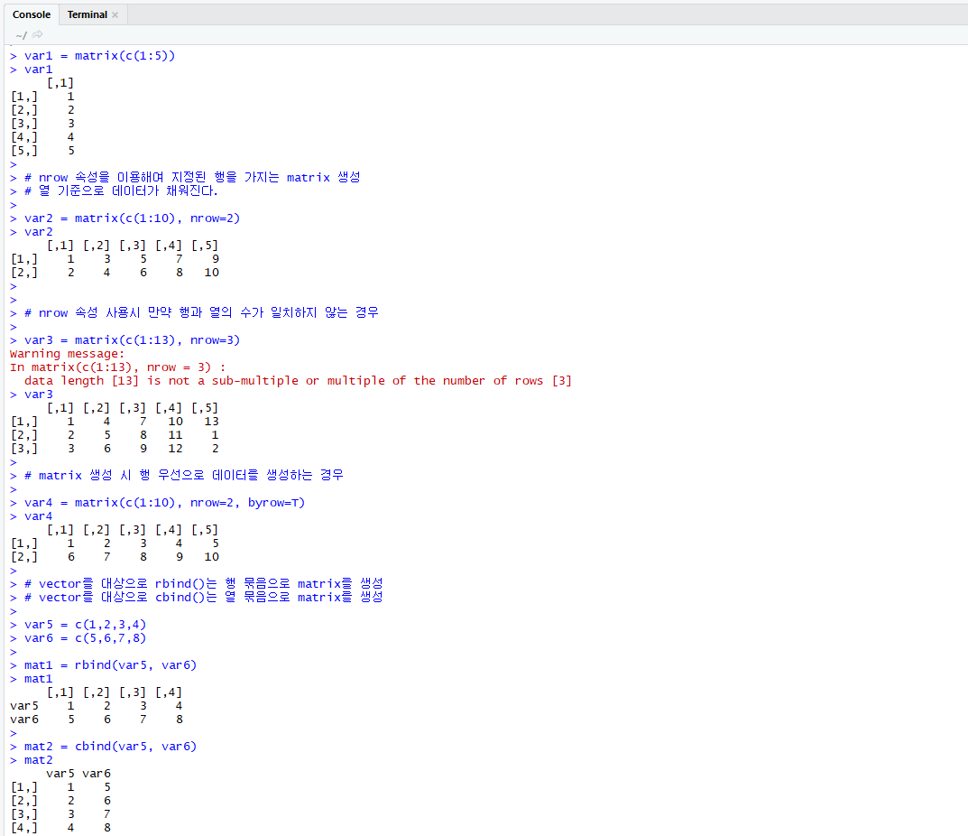 c() 함수를 이용하여 matrix를 생성할 수 있다. c()함수는 기본적으로 열을 기준으로 matrix를 생성한다.