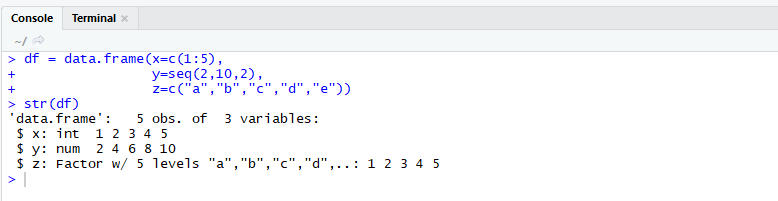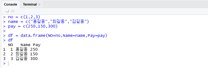 데이터 프레임(Data Frame)은 R에서 가장 많이 사용하는 데이터 형태로 행과 열로 구성된 2차원 형태의 표를 지칭한다.