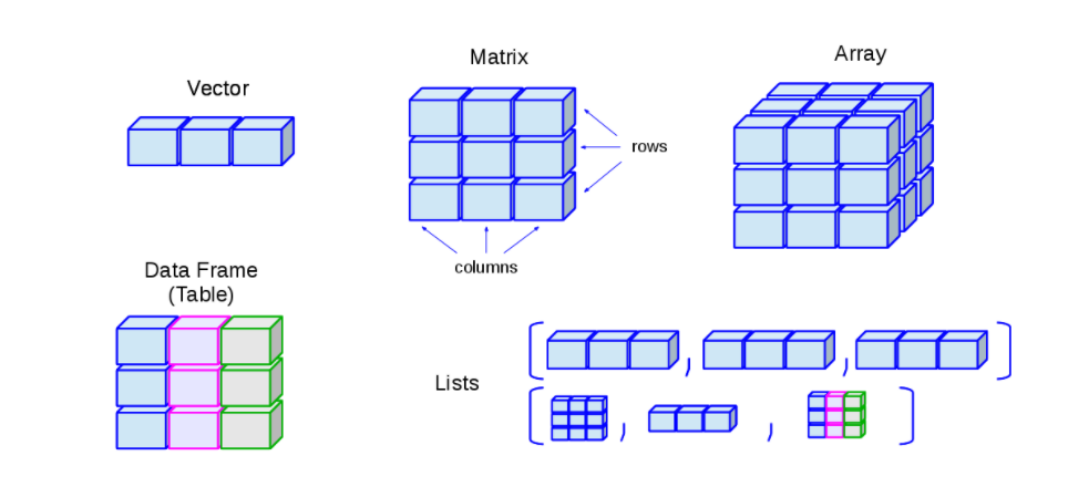 자료형(Data Type)은 저장된 데이터의 성격(숫자형, 문자형, 논리형)을 의미한다. 이에 비해 자료구조(Data Structure)는 변수에 저장된 데이터의 메모리 구조(배열, 리스트, 테이블)를 의미한다. 이런 메모리 구조는 객체가 생성될 때 만들어지기 때문에 자료구조를 객체형(Object Type)이라 한다.