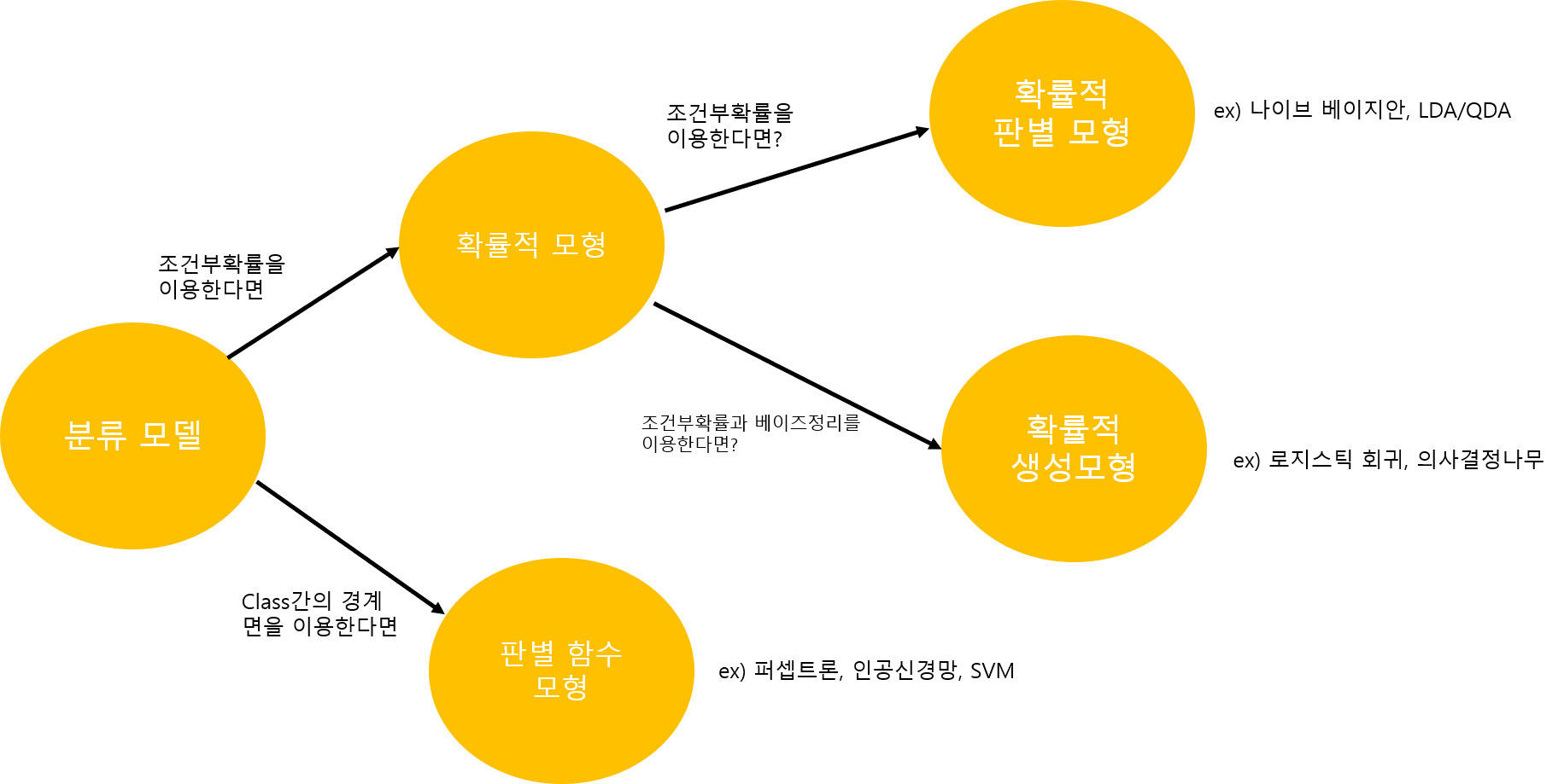 - 확률적 모형 : 주어진 데이터에 대해 각 카테고리 혹은 class가 정답일 조건부 확률을 계산하는 모형