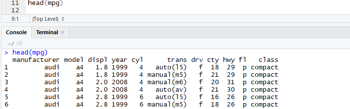 head() : 데이터의 앞부분을 추출하는 함수. 기본값은 5행이지만 data frame일 경우 앞에서 6행까지 추출.