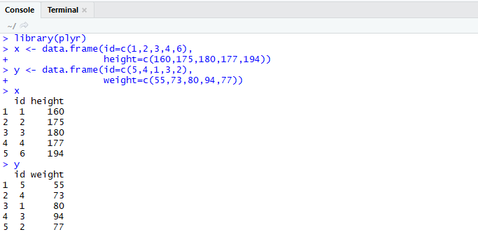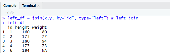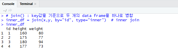 join() : key 값을 기준으로 두 개의 data frame을 하나로 병합을 한다. join에도 4가지 방식이 있다.