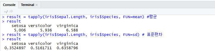 tapply() : 집단별 통계치를 구해주며 한 번에1개의 통계치만 구할 수 있다.