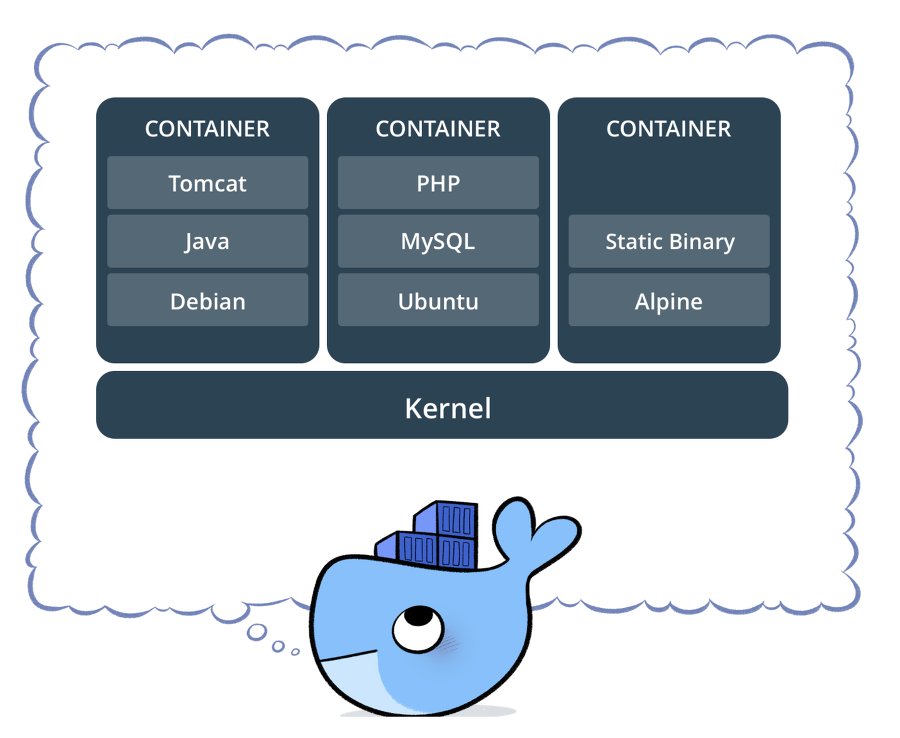 물리서버나 가상머신이나 모두 그것을 제어하는 OS를 실행하고 있다. 가상 머신으로 여러 서버를 하나의 물리적 서버에 실행시키더라도 가상머신마다 OS를 실행해야한다. OS는 범용 적으로 사용할 수 있도록 만들어져있는 반면, 많은 기능이 포함되어 그만큼 자원을 필요로 한다. 따라서 이 OS 부분도 공유 할 수 있다면 물리적 서버 한 대당 애플리케이션 집약도를 더 높일 수 있다.