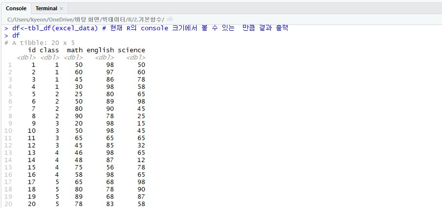 tbl_df() : 데이터 셋에서 console창의 크기만큼 데이터 셋을 추출하는 기능