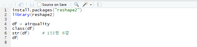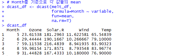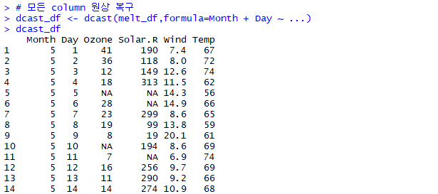 reshape2 package는 수집한 데이터를 분석하기 편한 형태로 가공할 때 사용하는 대표적인 package이며, 대표적인 2개의 함수가 존재하며 주로 이용 melt(), dcast() 함수를 사용을 한다.
