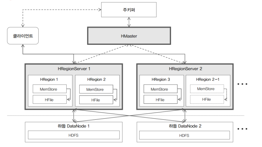 HBase는 하둡기반 분산 컬럼 지향 기반의 NoSQL이며, HDFS의 데이터에 대한 실시간 임의 읽기/쓰기 기능을 제공합니다. 사용자는 HBase나 HDFS에 직접 데이터를 저장할 수 있고, 사용자는 데이터를 읽고 접근하는 것은 HBase를 통한 임의접근을 이용한다.