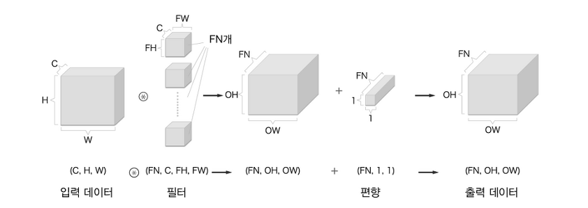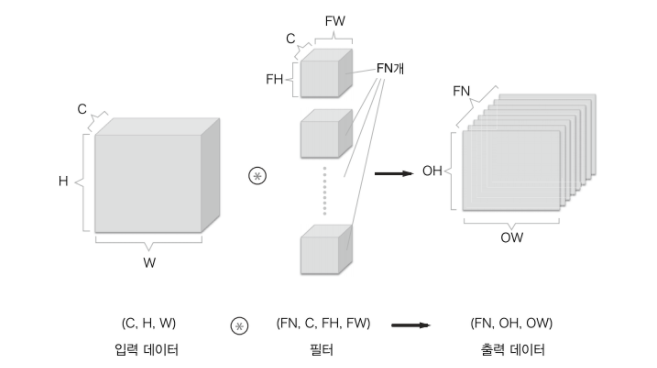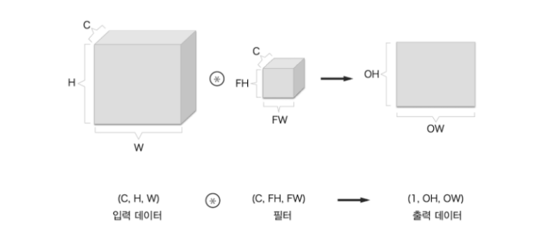 3차원 데이터를 다차원 배열로 나타낼 때는 채널(channel), 높이(height), 너비(width) 순서로 쓴다. 예를 들어 채널 수 C, 높이 H, 너비 W인 데이터 형상은 (C, H, W)로 쓴다. 필터도 같은 순서로 쓴다. 예를 들어 채널 수 C, 필터 높이 FH, 필터 너비 FW의 경우 (C, FH, FW)로 쓴다.