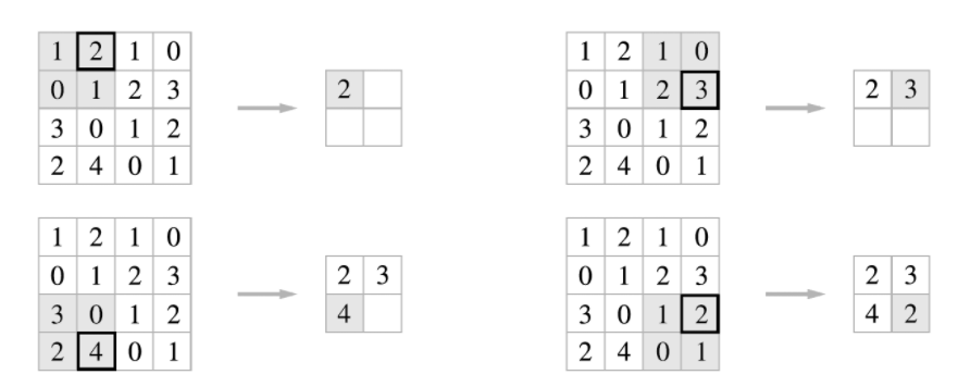 그림 13과 같이 2 x 2 영역을 원소 하나로 집약하여 공간의 크기를 줄인다. max pooling을 스트라이드 2로 처리하는 순서이다. max pooling은 최댓값을 구하는 연산이며 2 X 2 크기 영역에서 가장 큰 원소 하나를 꺼낸다. 또한 스트라이드위의 예에서 2로 설정했으므로 2x2윈도우가 2칸 간격으로 이동한다. 참고로 풀링의 윈도우 크기와 스트라이드는 같은 값으로 설정하는 것이 보통이다.