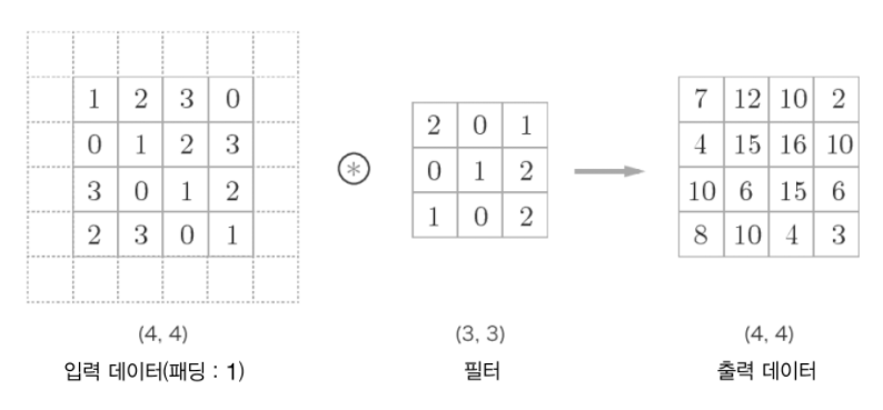 합성곱 연산을 수행하기 전에 입력 데이터 주변을 특정 값(예컨대 0)으로 채우기도 한다. 이를 패딩(padding)이라 하며, 합성곱에서 자주 이용하는 기법이다.