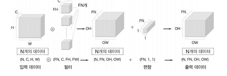 여기에서 주의할 점으로는 신경망에 4차원 데이터가 하나 흐를 때마다 데이터 N개에 대한 합성곱 연산이 이뤄진다. 즉 N회 분의 처리를 한번에 수행하는 것이다.