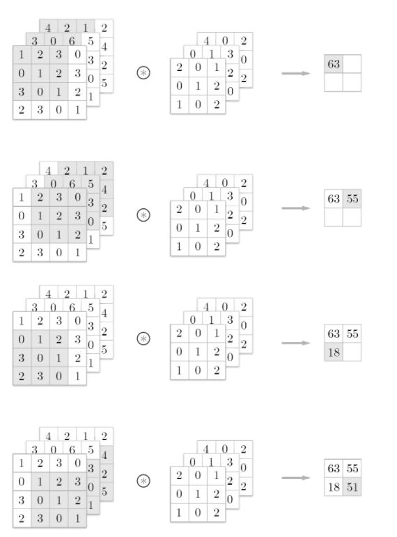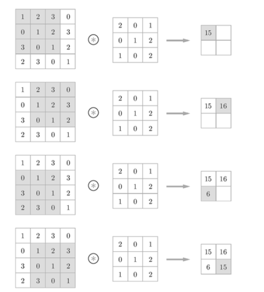 그림 3과 같이 합성곱 연산은 입력 데이터에 필터를 적용한다. 이 예에서는 입력 데이터는 세로 x 가로 방향의 형상을 가졌고, 필터 역시 세로 x 가로 방향의 차원을 갖는다. 데이터와 필터의 형상을 (높이 height, 너비 width)로 표기하며, 이 예에서는 입력은 (4,4), 필터는 (3,3), 출력은 (2,2)가 된다. 필터를 커널이라 칭하기도 한다.