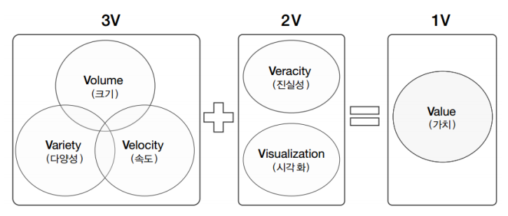 지구상에선 지금 이 순간에도 방대한 크기(Volume)의 다양한(Varity) 데이터들이 빠른 속도(Velocity)로 발생하고 있다. 빅데이터는 3V(Volume, Varity, Velocity)를 수용하며, 데이터의 진실성(Veracity)을 확보하고, 분석 데이터를 시각화(Visualization)함으로써 효익을 가져다줄 가치(Value)를 창출 하는 것이다.