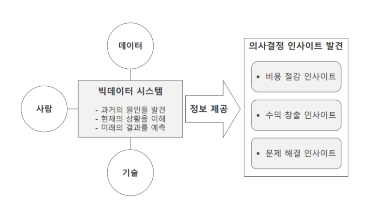 빅데이터 시스템의 목적은 크게 비용절감인사이트, 수익 창출인사이트, 문제 해결인사이트를 찾는 것이 최종목표이다.