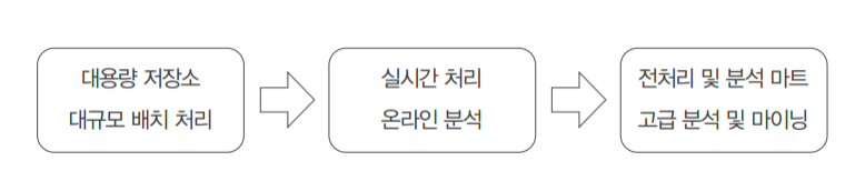 대용량 저장소 대규모 배치 처리 -> 실시간 처리 온라인 분석 -> 전처리 및 분석 마트 고급분석 및 마이닝 순으로 변화를 하고 있다.