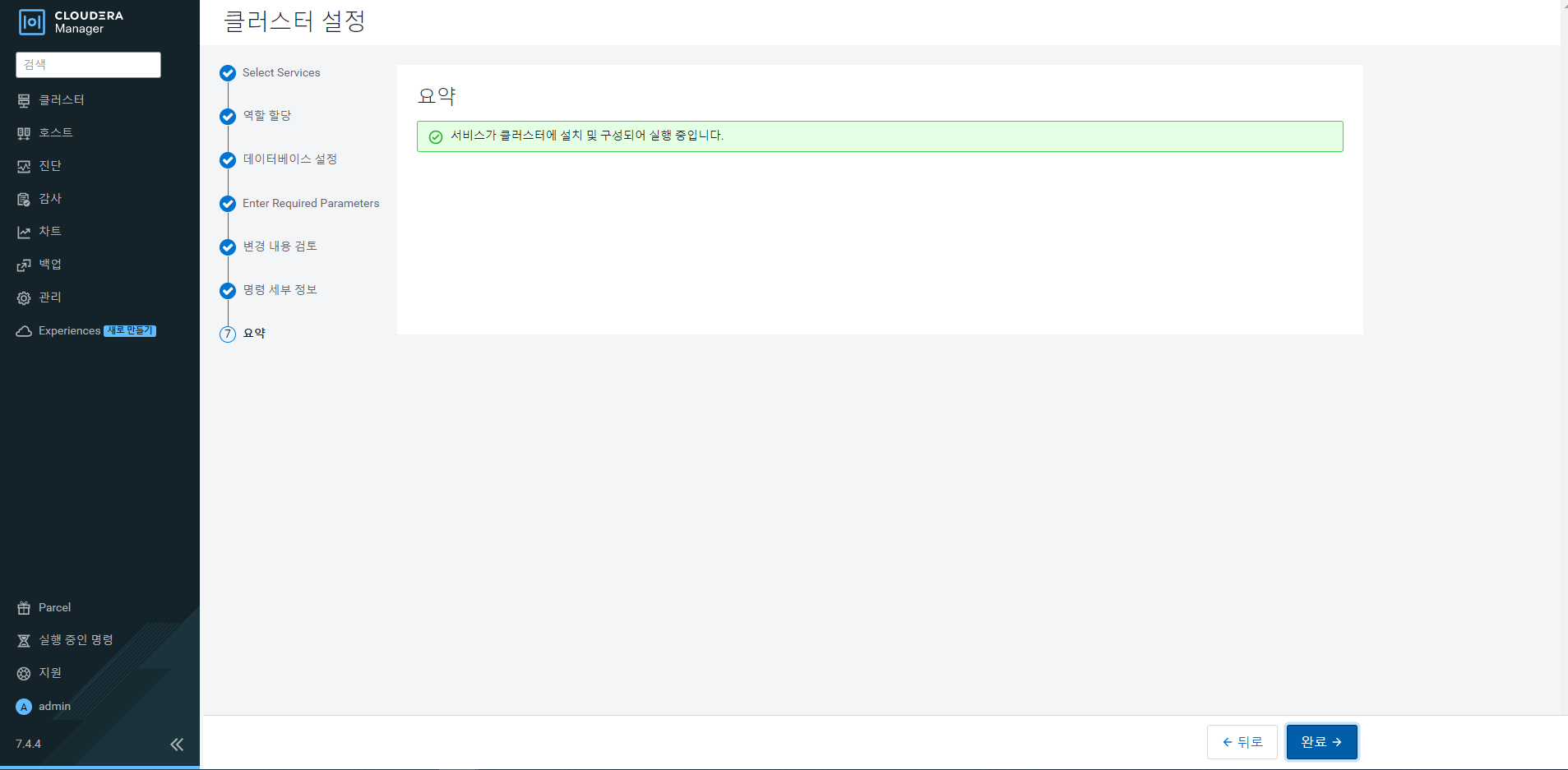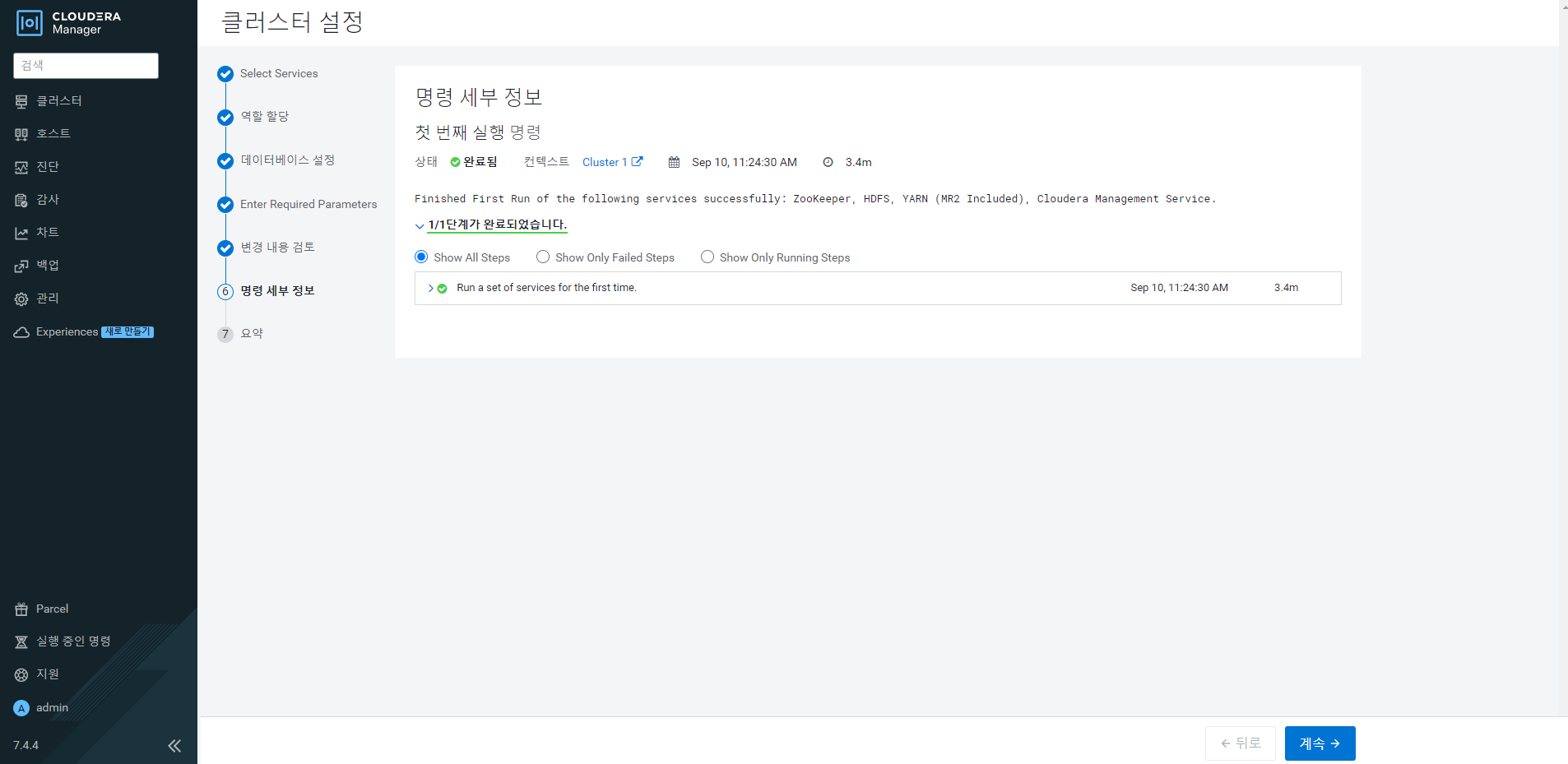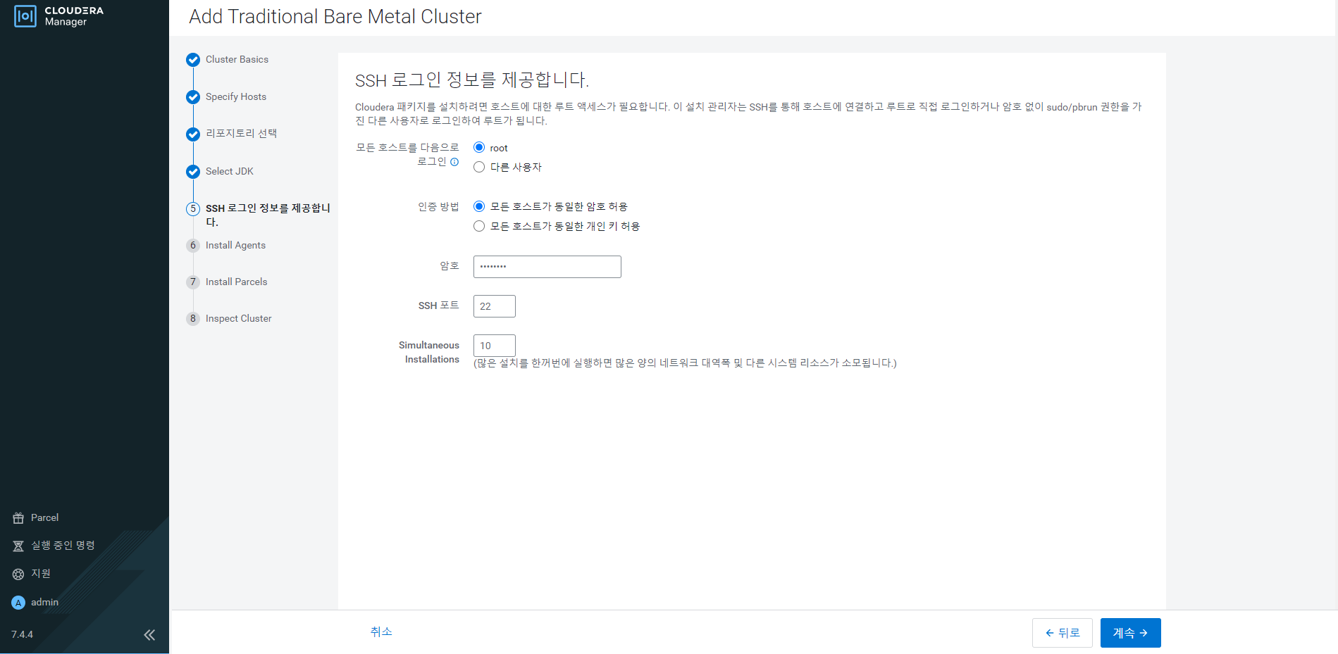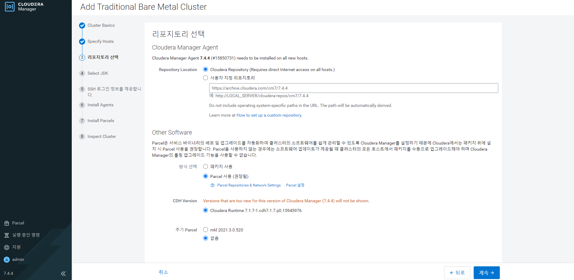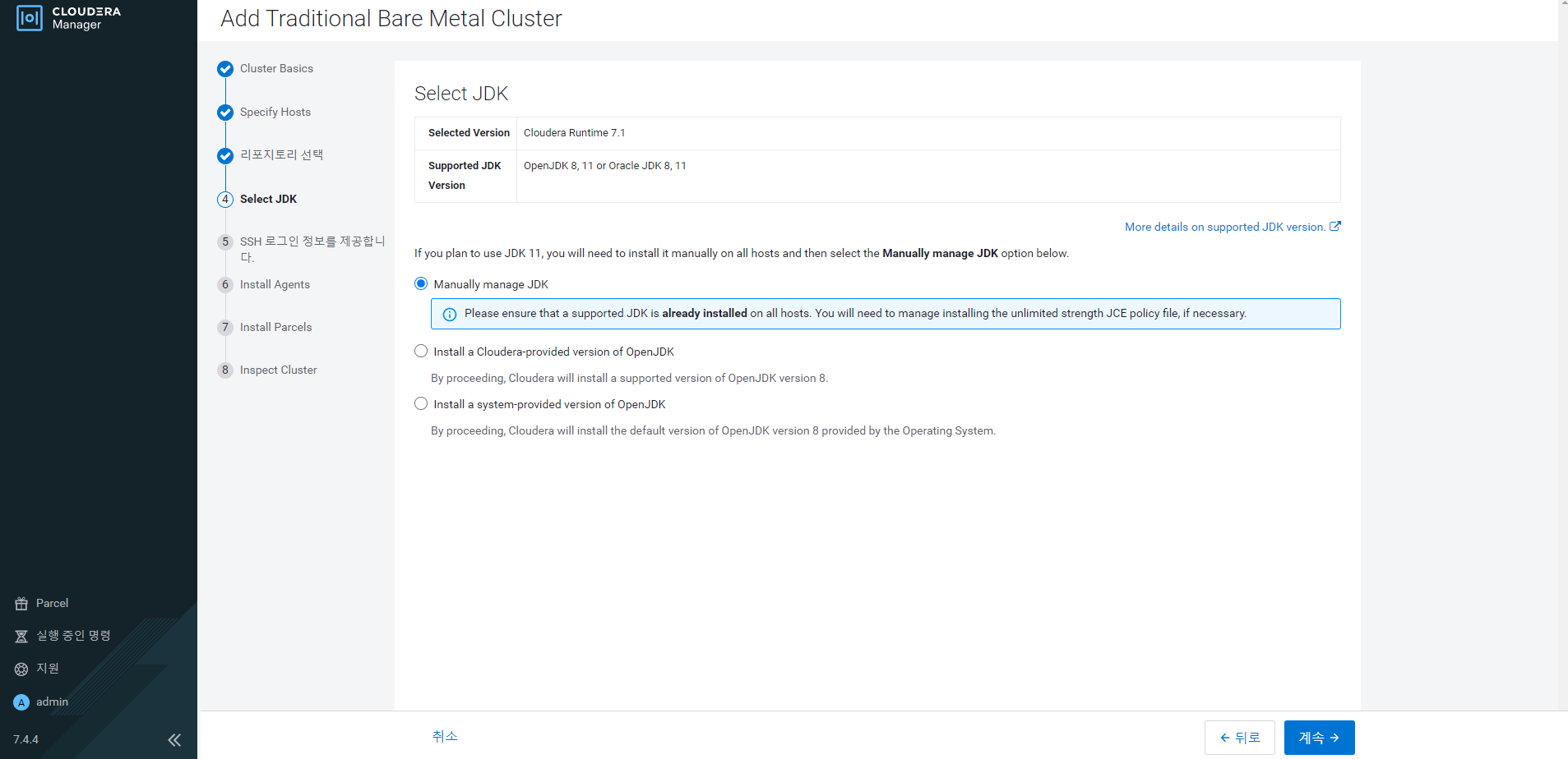설치 후 Your browser should now open to http://localhost:7180/. Log in to Cloudera Manager with username: 'admin' and password: 'admin' to continue installation. 문구가 나온다.