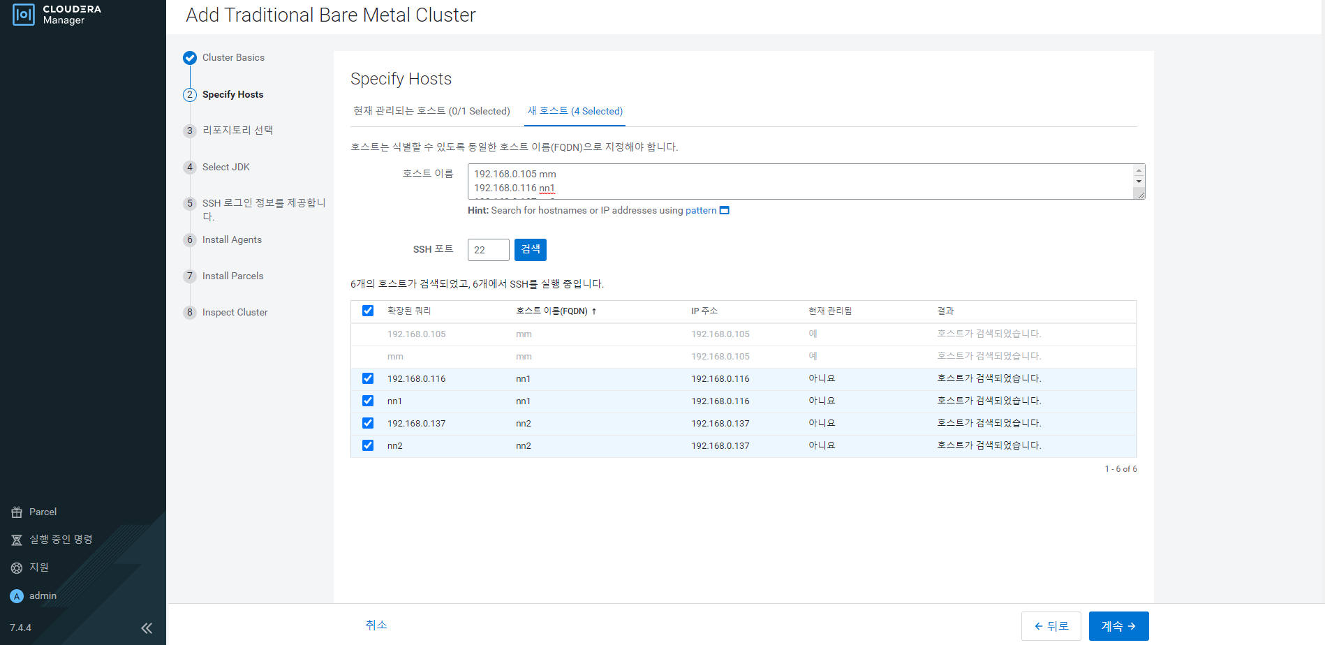 새 호스트 선택하고 설치한 머신 ip,호스트이름 검색하기를 누른 후 계속을 누른다.