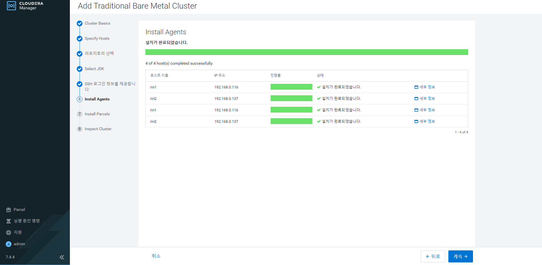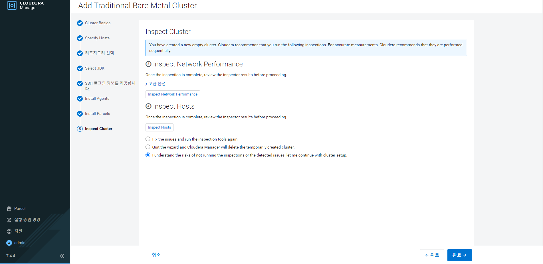 설치가 완료가 되고 I understand the risks of not running the inspections or the detected issues, let me continue with cluster setup을 체크를 한다.