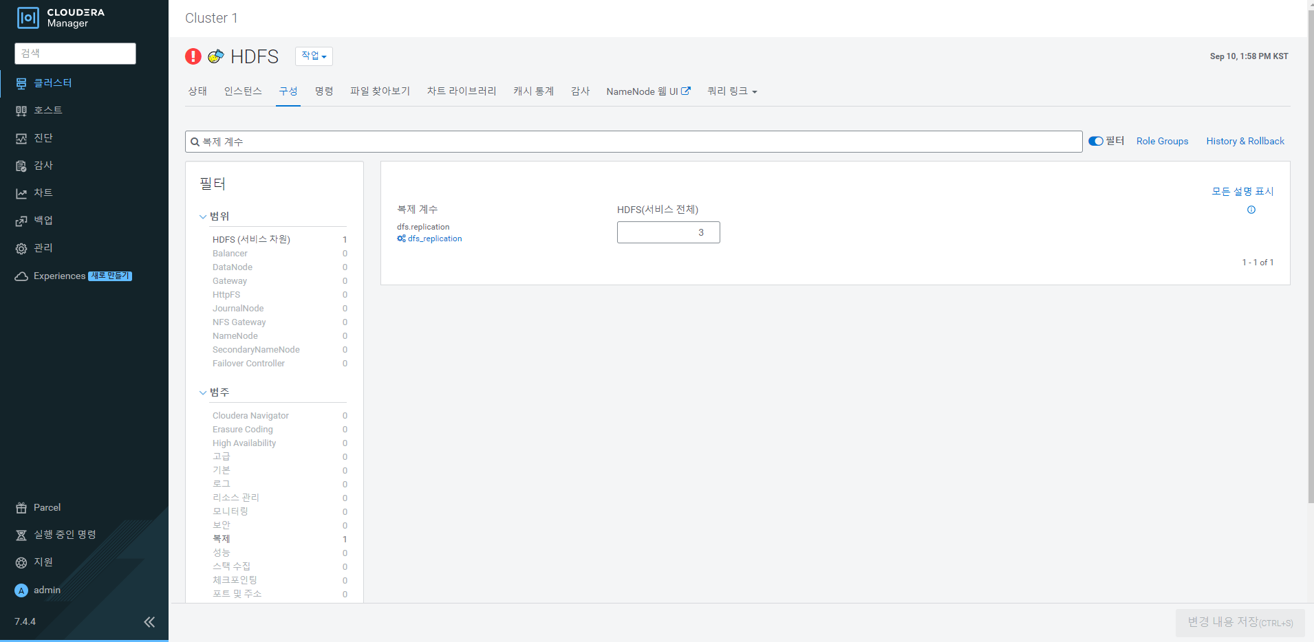 현재 가상머신은 사양은 좋지않아서 HDFS 복제 계수를 3에서 2로 낮춘다.