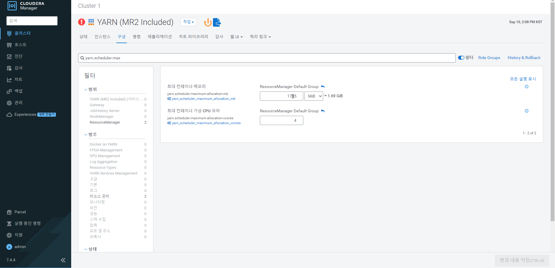 yarn.scheduler.max 검색 후 설정변경을 한다.