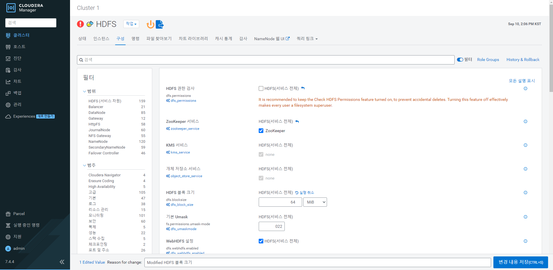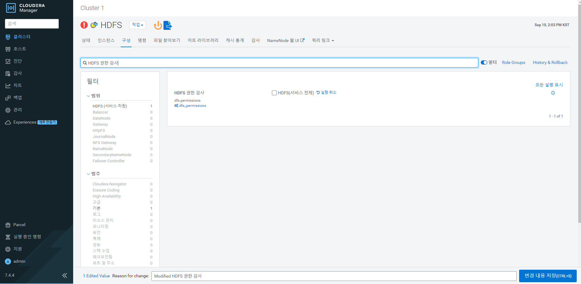 검색창에 HDFS 권한 검사라고 검색을 하면 설정을 바꿀 수 있는 화면이 나온다.