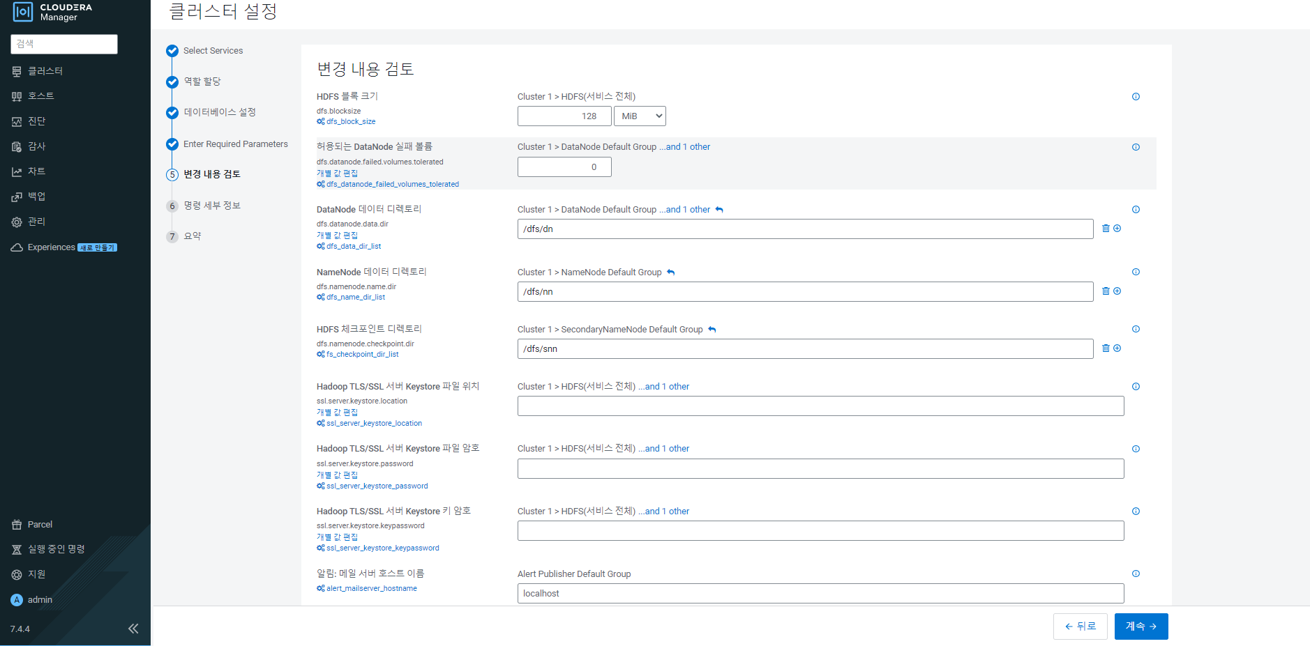 하둡 설정을 설정할 수 있는 단계이다. 기본설정으로 한 후 설치를 진행을 한다.